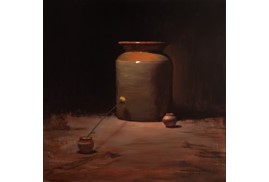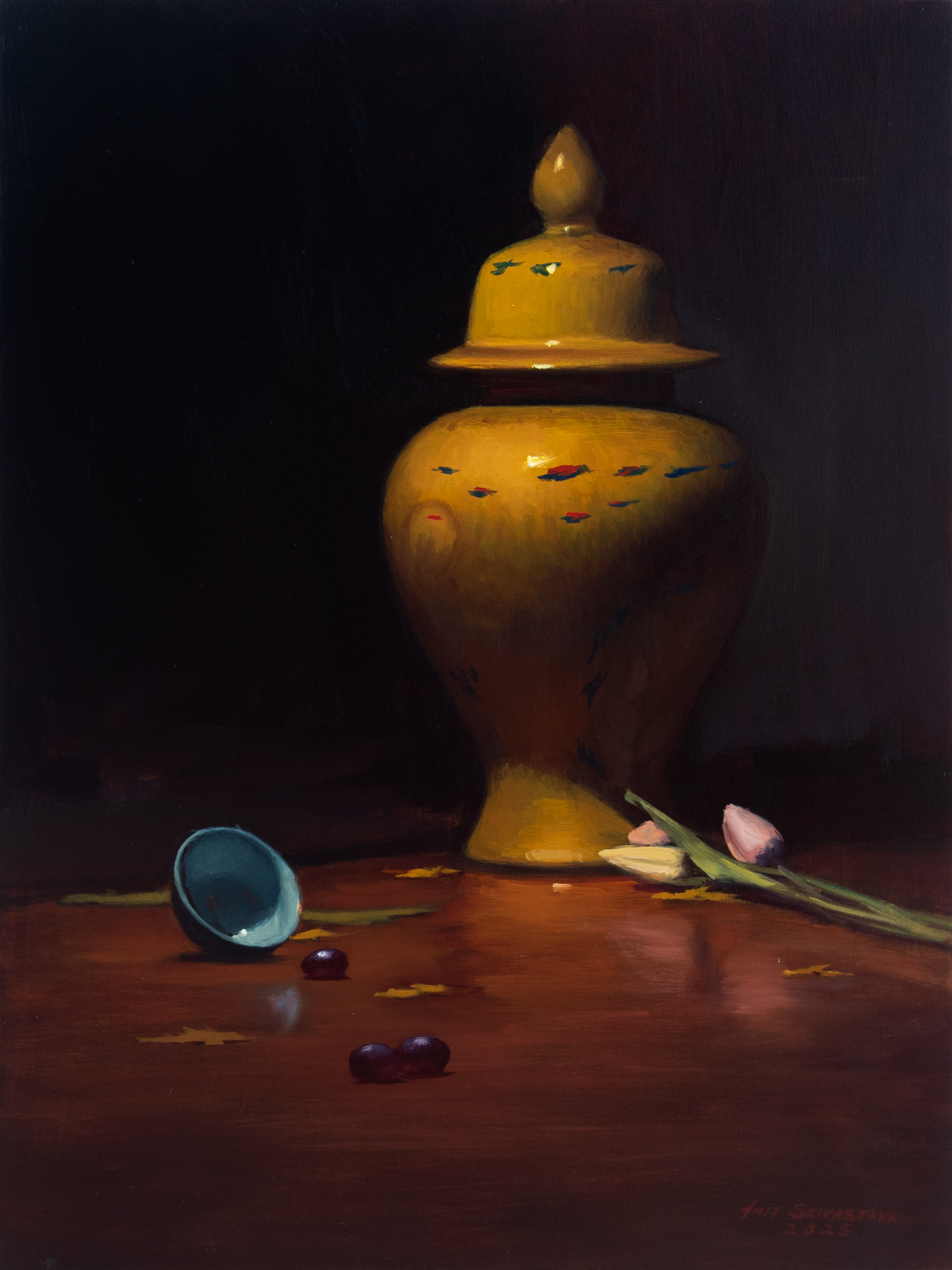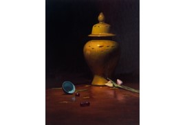 Item Code: amit sri 07 Size: 18 x 24 in. (45.72 x 60.96 cms.) The Yellow Temple Jar 2025 Oil on Canvas