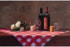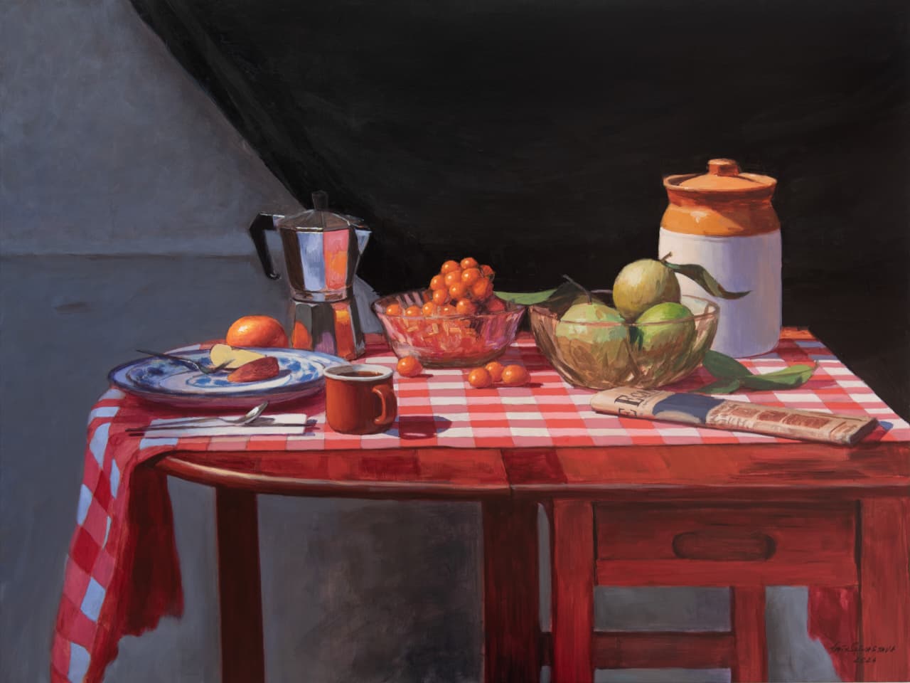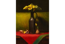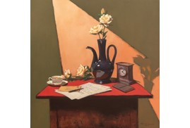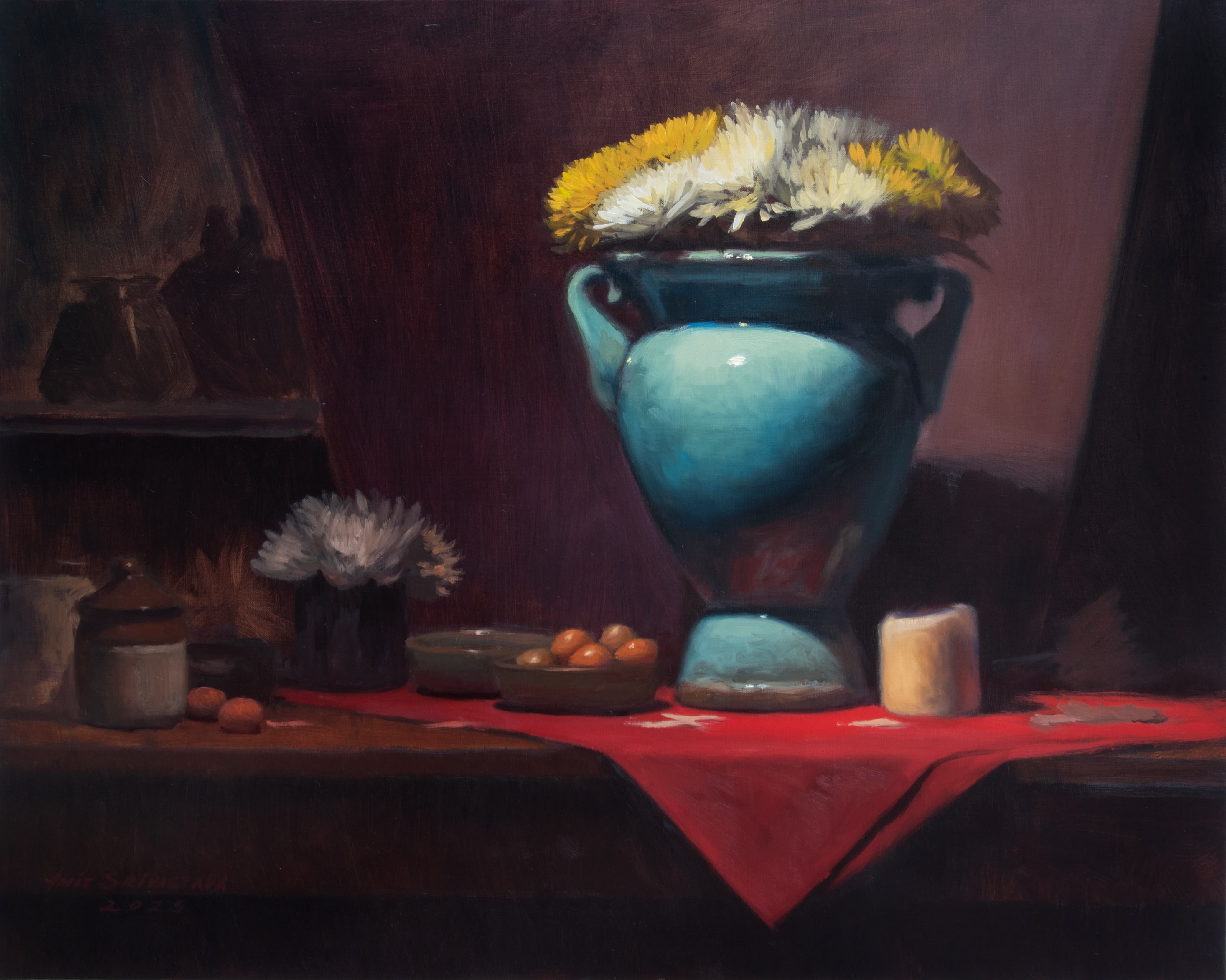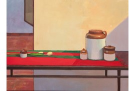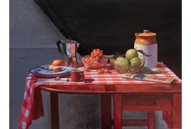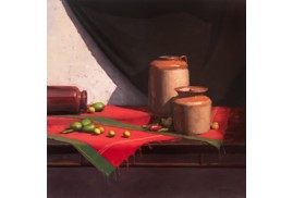 A strong command over colour, whether in oil or acrylic, is clearly visible. The lush, deep red of the tablecloth, recurring across his works, is noteworthy. Indeed, red tablecloths have figured as a significant element in several seminal paintings in history, such as The Red Room (Harmony in Red) by Henri Matisse and Still Life on a Red Tablecloth by Georges Braque. Frequently seen in still life as a unifying base, the tablecloth lends warmth to what it holds.