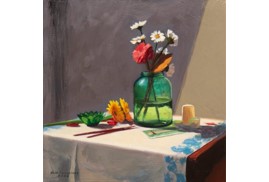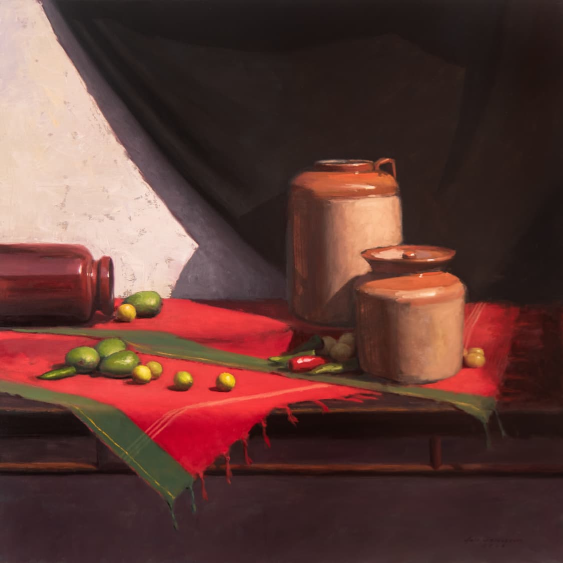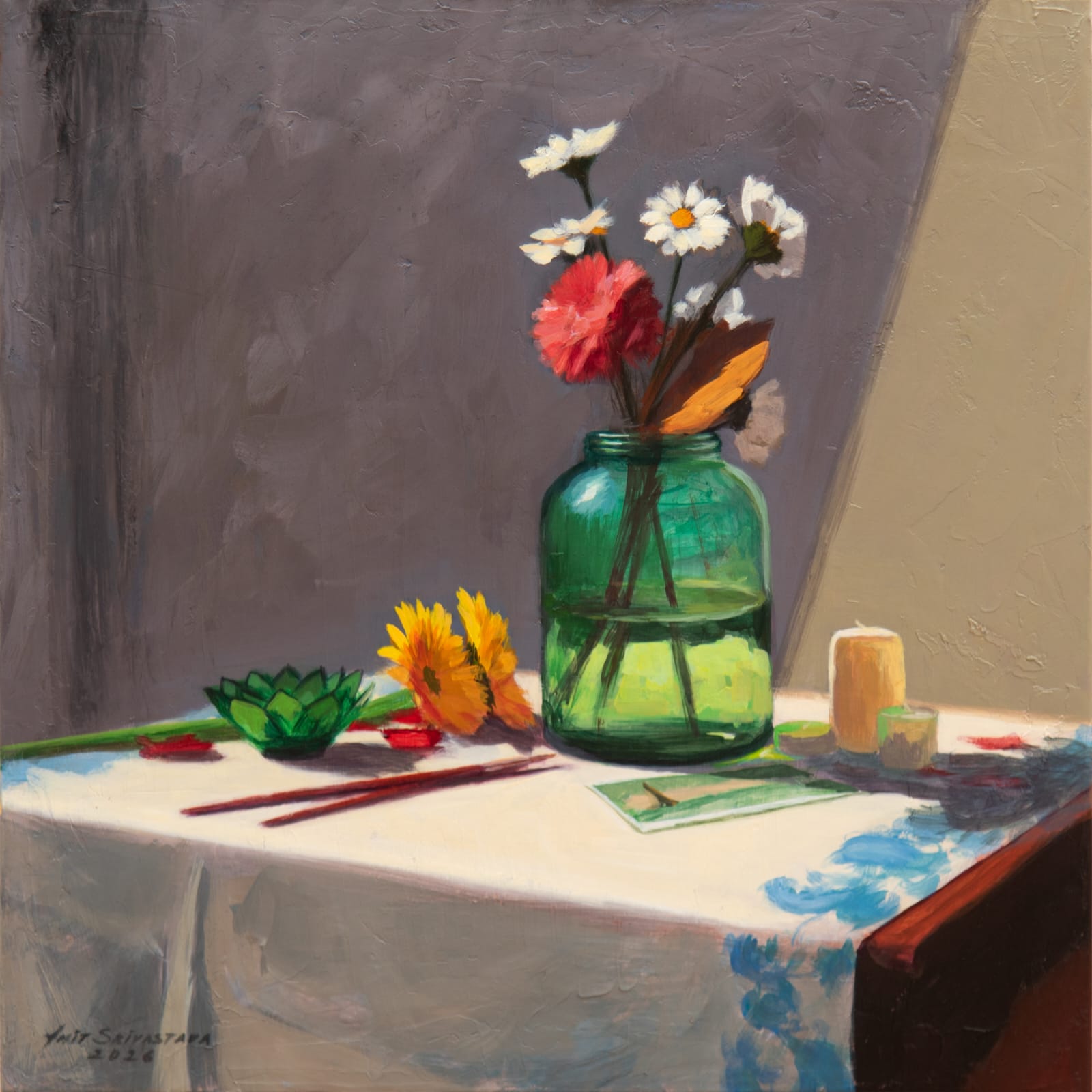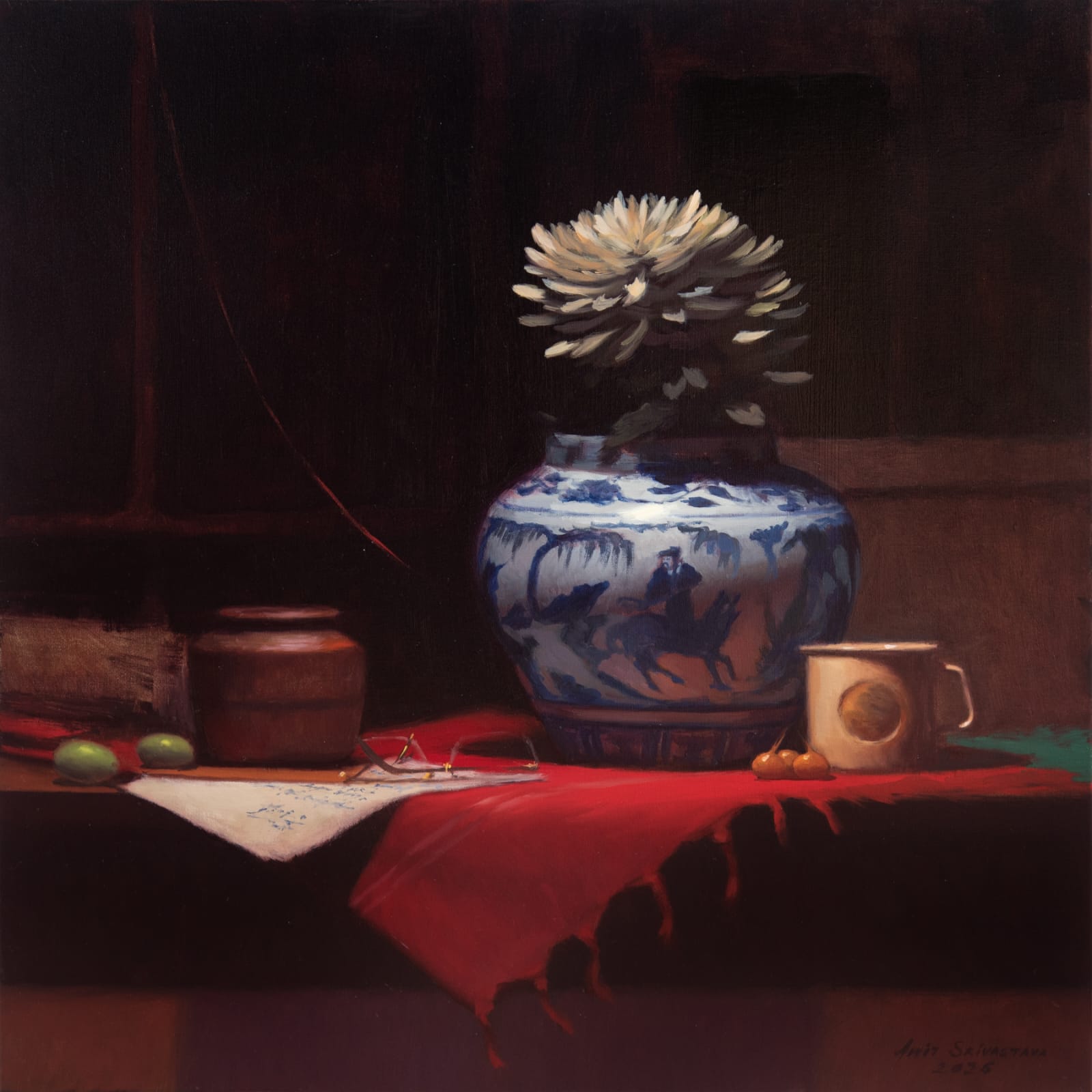A strong command over colour, whether in oil or acrylic, is clearly visible. The lush, deep red of the tablecloth, recurring across his works, is noteworthy. Indeed, red tablecloths have figured as a significant element in several seminal paintings in history, such as The Red Room (Harmony in Red) by Henri Matisse and Still Life on a Red Tablecloth by Georges Braque. Frequently seen in still life as a unifying base, the tablecloth lends warmth to what it holds.