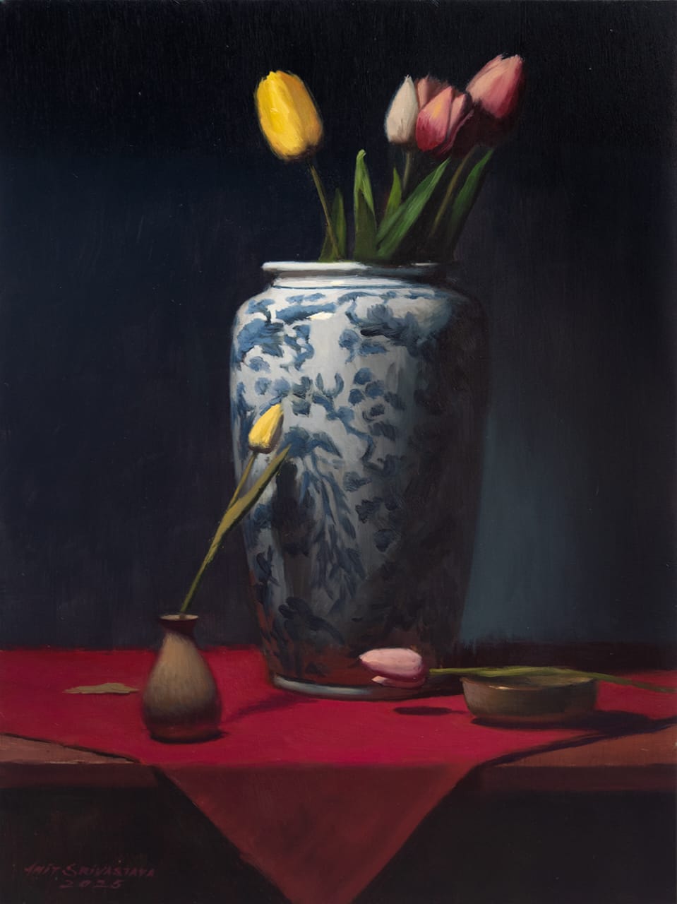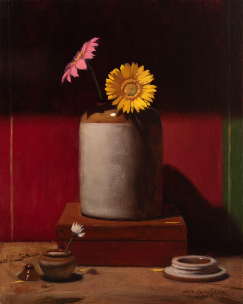 In this context, the emergence of an artist like Amit Srivastava, who has devoted his skills to the art form of still life, draws our attention once again to the genre. Interestingly, with a background in engineering as an alumnus of IIT Delhi, Amit has turned to still life with a rare dedication, training himself diligently and honing his creative abilities to bring alive the ‘subjects’ of his choice. Not only objects, but even figures in his works seem attuned to the still-life sensibility, carrying a similar inwardness, a quietude, as though they too are part of a moment that has chosen to remain. In one of the works, the stillness extends to the sky itself, where even the clouds seem at rest.